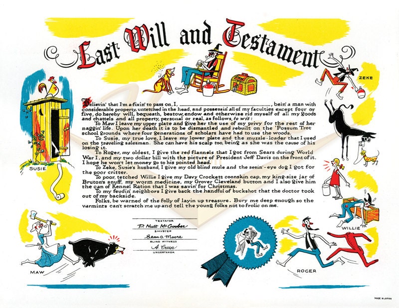 The attorney thanks all of them for coming and then reads out morris's last will and testament. Funny last will and testament / last will and testament. My son, sam, i want you to take the ocean reef. He asks for two witnesses to be present and a camcorder be in place to record his last wishes. In henry budd's last will and testament he left £200,000 in 1862 in trust for his two sons on the condition that neither grow a moustache. 21 dec 2012 current rating: Last modified on tue 22 nov 2016 07.57 est t wo years ago, my partner and i finally wrote proper wills. The basic instructions for guardianship of our young children, written years before, were no. With these last words we are ready to graduate and ready to start life outside of high school. Morris dies suddenly soon after his 70th birthday. Funny story about last will and testament. A $100 million estate left to the wrong people. Last will and testament cartoons and comics.
